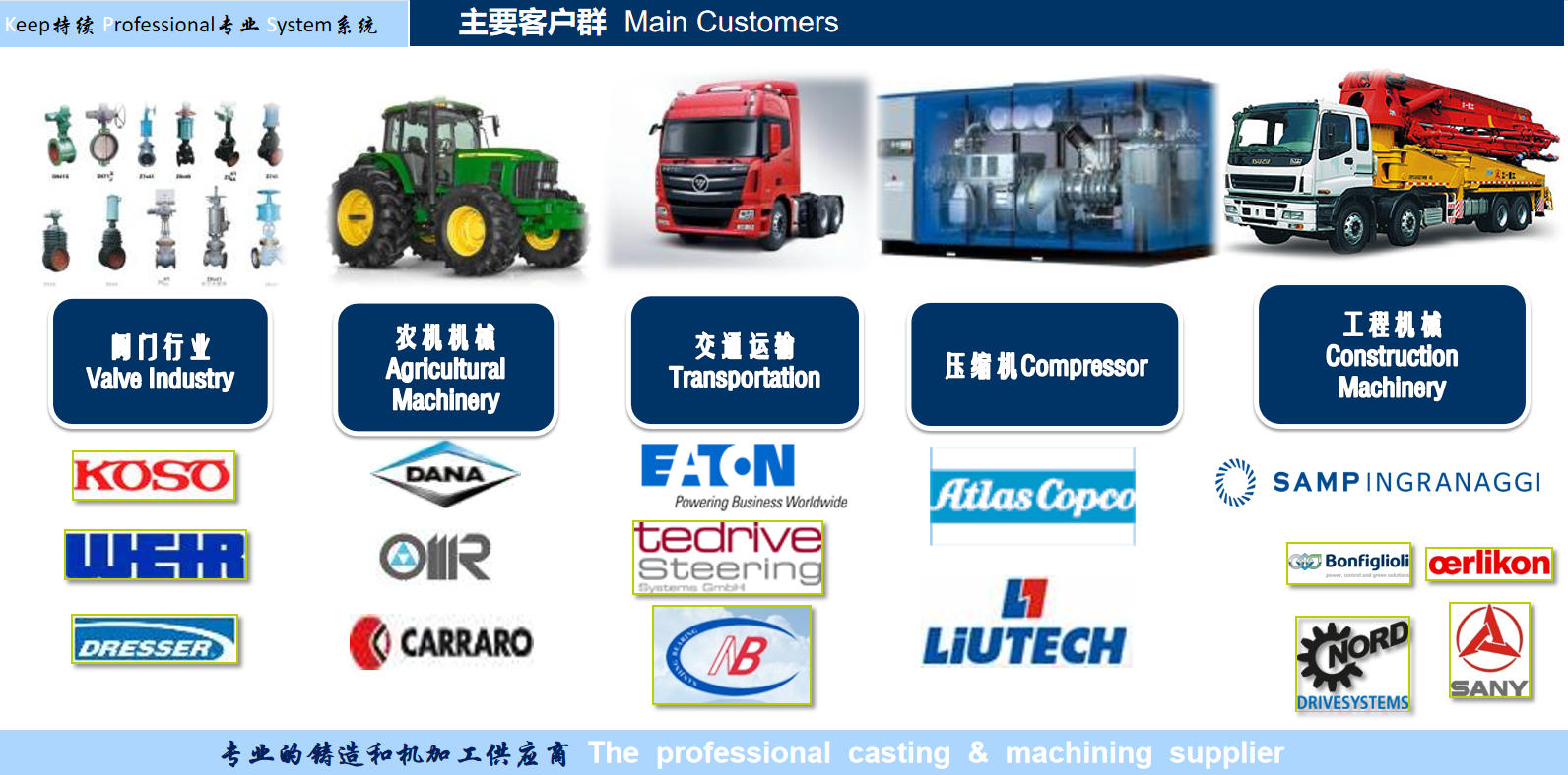 杰联铸造厂生产灰口铸铁、球墨铸铁系列产品,代表牌号有HT150~HT350、QT400~QT700。产品主要为汽车零部件,柴油机配件,高铁零部件、泵、阀及纺织、农用、装载等工程机械配套,除国内使用外,远销美国、德国等多个国家和地区。目前主要供应商南京华东转向器厂,扬柴,上柴,三一重工,韩国VOLVO,山东临工,法国富兰克林等。