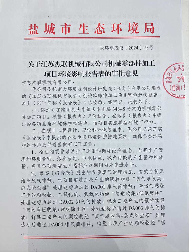 关于江苏杰联机械有限公司机械零部件加工项目环境影响报告表的审批意见